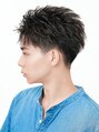アップバングにソフトツイストフェザーを加えた男らしいスタイル。