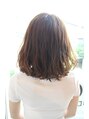 ミディアムのウエーブスタイルです。前髪は眉上に設定してカットで丸さをつくり、コールドウエーブで毛先中心に遊びをつくり立体感をだしています。