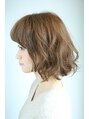 アゴラインのウェーブのボブです。パーマで動きをつくったのでラフで無造作な動きが楽しめます。カラーは10レベルのウォームアッシュブラウンですのでパーマのラフな動きと絶妙にマッチしてより躍動感を演出しています。