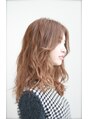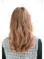 前髪はリップラインでカット。デジタルパーマでMIX巻き。カラーはオレンジベージュベースで毛先に多めのハイライトでナチュラルなグラデーションカラー。