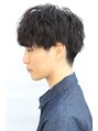 サイドはツーブロック、バックは刈り上げ、トップはショートレイヤーベースです。前髪は分けることも下ろすこともできる目上の長さです。緩めのパーマをかけクセ風のカールが出るようにしています。セット次第でどんな場面にも対応できるスタイルです。