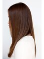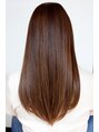 髪を暗めにしてツヤ感を強調したストレートスタイルです。顔周りはレイヤーを入れて顔を包みこむように切っていますので小顔効果も期待できます。毛先を少し重めにしていますので、乾かすだけで簡単にまとまるヘアスタイルとなっています。