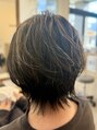 ハイライトのデザインカラーを表面メインでいれて、根元の白髪(こめかみあたり)が増えてきてもわかりにくいように白髪ぼかししました。