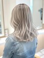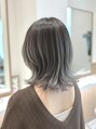 赤みをしっかり抑えたシルバーグレージュカラーで、柔らかさとクールさを両立。鎖骨上のミディアムレングスにレイヤーを入れ、毛先はラフな外ハネ仕上げに。重く見えがちな寒色系も、透け感カラーで軽やかな印象に仕上げています。
