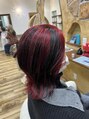 赤と黒で作るデザインカラー!それぞれが交互にはいっており、後ろに毛流れをつけることで混ざり合ってとっても可愛いです!全頭ブリーチから塗り分けてカラーしております!