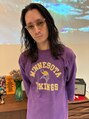 セイムレイヤースタイルに大きめのウェーブパーマをかけたスタイル。スタイリングはウェットにグリースを揉み込むだけ。造り込みすぎないのがポイント。