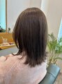 暗めのオリーブカラーで、柔らかさを残しながら暗くしています。長めのボブで顔周りだけレイヤーいれて、少しくびれが出るように作ってます!スタイリングも楽チンで、結べるのでおすすめです。