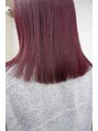 ワイドバングにもみあげの後れ毛をポイントにしたスタイル顔まわりが邪魔にならず、かつお洒落感を損なわない。カラーはブリーチなどはせず色味を濃く入れたワインレッドブリーチしないとできないようなカラーがダメージレスでワンカラーで叶えられます!