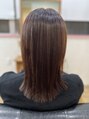 やわらかなミルクティーベージュに、細かく入れたハイライトで立体感と透明感をプラス。髪質改善と同時施術で、ダメージを抑えながら指通りなめらかな艶髪に仕上げます。
