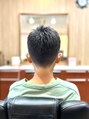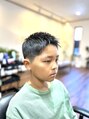 生え際を3ミリからつないだ刈上げショートスタイル。寝やすい髪質に合わせてカットし、セニングで立ち上がりを付けやすく調整しハードワックスでセットしたキッズショートスタイル。