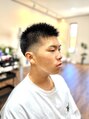 サイド、バックを中心に1ミリからの刈上げ。トップは伸ばす途中で軽さを入れる程度に。刈上げの高さや角度を意識して短髪ショートでもおしゃれに見えるようにカット。ジェルワックスでウェット感と束間を出したスタイリングに。