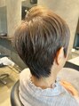 耳周りをスッキリ。耳の周りがビッシリ生える方なのでスッキリ切ってあげるのがポイント。トップがぺたんとなりすぎるが、レイヤーを入れすぎると縦長のイメージが強くなるので入れすぎず、ディスコネにし、襟足は削って頭を短く見せる。Yushi Hair MINA