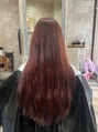 ハイライトを細かく入れるとハイライト部分とそれ以外で発色の差がでます。色のコントラストを楽しむカラー方法です。同じレッド系でも濃いボルドーや真紅など違うレッドカラーを楽しめます。ストレートなら艶、巻くと立体感がより出ます。