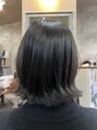 暗髪ボブで大人っぽいスタイルです。丸みのあるボブは可愛らしい印象になり、シャープなボブはカッコいい印象になります。カラーはブルーブラックで艶と透明感をだしました。サイドバングを多めに作りお顔周りのデザインを整えて小顔効果狙いです。