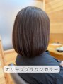 艶ミディアムヘアまとまりあるミディアムスタイル!毛先に重さがたまらないように、内側で毛量調節しています。オリーブブラウン色にすることで、明るさをプラスし!!透明感◎艶◎