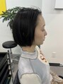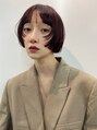 顎下まで伸びたボブをリップラインまで切り込んで、顔周りは緩やかな前上がりでコンパクトなミニボブに仕上げています。色味はブリーチなしのWカラーで深く発色のいいダークローズを入れています。