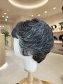ライトブラックの髪色に一本ずつ白髪を植えたフルウィッグです。もみ上げの辺りは30%、後頭部は10%、襟足は5%と、白髪の割合を変えられるのも手植えならでは。 既製品ウィッグでもここまでできます。