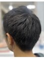 トップに自然な動きを出し、後頭部は丸みのあるシルエットに。襟足は刈り上げず首に沿わせて、やりすぎない清潔感を演出。伸びても形が崩れにくい、扱いやすいメンズショートです。