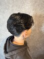 サイドと襟足は低めにフェードを入れて清潔感をプラス。トップは動きが出るようにカットし、パーマでラフな毛流れを演出。セットも簡単で、ON/OFFどちらでも使いやすい万能メンズスタイル。