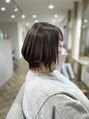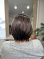 軽いショートカット。オークルにリーフを少し混ぜてカラーいたしました。癖毛のお客様なので縮毛矯正をしています。レイヤーの丸みはアイロンで少しセットしていますが、とても簡単です。