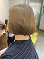 ダブルカラーで作る柔らかいベージュボブ。軽さを出さず毛先に程よい重みを残すことで、落ち着きと上品さをキープ。抜け感のある色味で大人カジュアルな雰囲気に仕上がります。
