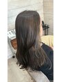 顔まわりにしっかりレイヤーを入れた、小顔効果の高い重さは残しつつも、表面のレイヤーで動きと軽さをプラスして大人っぽさを引き出しています。前髪は束感が出る透けバングで、抜け感のある柔らかい印象に。30代の大人女性に人気のカラーです。