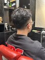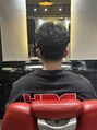 サイドから襟足にかけてはスッキリと刈り上げたツーブロックで、清潔感のあるシルエットに。トップは緩めのパーマをかけて、ラフにスタイリングしても立体感が出るようにしています。