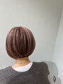 春らしい淡いピンク系ヘアカラー ブリーチは全体ではなく、ハイライト施術する事によって色味の濃淡が出るので、立体感のあるカラーリングにカットは襟足短めのコンパクトボブ