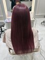 深みのあるボルドー系カラーで仕上げた、艶重視のストレートスタイル。赤みを活かしつつ、紫をほんのり含ませることで上品さと色気をプラスしています。光に当たるとツヤがしっかり出て、ロングでも重く見えにくいのがポイント!
