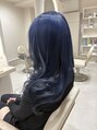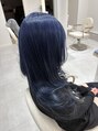 しっかりブリーチベースに濃いめのブルーをのせることで、光に当たると透けるような青みが際立ち、室内では落ち着いたダークトーンに見える上品カラーに仕上げています!色落ちはグレー~シルバー寄りに変化していくので、過程も楽しめるカラーです。