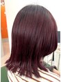 深いボルドーレッドで光加減によって色味の変化を感じていただけるお色味♪切りっぱなしボブに再度にレイヤー入れることで前から見た印象はウルフですが後ろから見ると重ためで見る角度で雰囲気が変わります☆