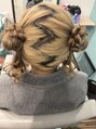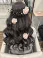 結び目は三つ編みでゴム隠しして、ハートを一つ作りました。ウェーブ巻きがかわいい!!ハートを作るのは別料金がかかります。