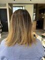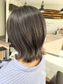 黄色く明るく抜けた髪に、アッシュグレイで落ち着かせ、光に当たると薄いグレイが発色してツヤツヤに。伸びてしまった毛先も肩上でカットし毛量調整したらスッキリまとまる。肩上で自然にハネる感じが可愛くてオシャレ