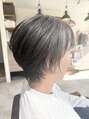 シンプルなショートスタイル。自然なグレーヘアで襟足をタイトに軽く、耳も透けるようにサイドをカット。トップを長めに残して必要な所だけをカットした。重さと軽さをはっきり分かるとスタイルがグッと引き締まります。