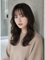 鎖骨下で揺れるミディアムレイヤーに、ゆるやかなウェーブを重ねた柔らかい印象のスタイル。透け感のある前髪と自然なボリューム感で、抜け感と上品さを両立した大人フェミニンな仕上がりです。