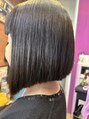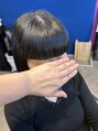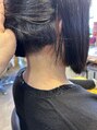 シャープな前下がりボブになります。毛量が多いので、タイトにするために襟足を刈り上げて、表面は被せた状態になっています。矯正を4ヶ月に一回かけています。前髪もまっすぐにするために丁寧にカットしております。