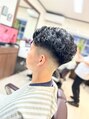 周りはスッキリとフェードで刈り上げパーマでバックに流れにくいトップの髪を巻き、ハチ部分は逆巻きで毛流れを表現しています。※フェードの方はフェードスタイルをクーポンに追加してください。