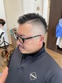 しんさい刈りとフェードカットの融合短くカッコいいスタイル パートラインを入れる事で分けやすくジェルやグリースでツヤのあるセットで仕上げています