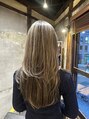 細かく入れたローライトで髪に自然な陰影をプラスし、立体感と奥行きを出したロングレイヤースタイル。明るさを抑えながらも重く見えず、動くたびに表情が変わる大人向けのデザインです。白髪ぼかしとしても相性が良く、伸びてきても馴染みやすいのが特徴。