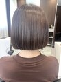 以前の美髪矯正で整えたツヤ髪ベースに、今回は頭皮と髪に優しいダメージレスカラーをプラス。乾かすだけでまとまるミニボブと、自然なツヤ感が魅力のスタイルです。