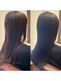 オレンジっぽく抜けた髪を、赤みを抑えた深みのある透明感カラーへ。光に当たると透ける絶妙な色合いで、上品な印象を演出します。独自の配合でダメージを抑え、染める前より艶やかに。色落ちも綺麗に楽しめる、大人女子に大人気のカラーです!