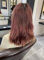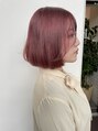 傷んでいる髪の毛をバッサリ顎下までカットし、ボブにスタイルチェンジした後根元からピンク+レッドを混ぜたカラーに仕上げました!!顔周りにも短い髪を作り小顔魅せ効果を引き出す為に顔に沿うように切りこみました!